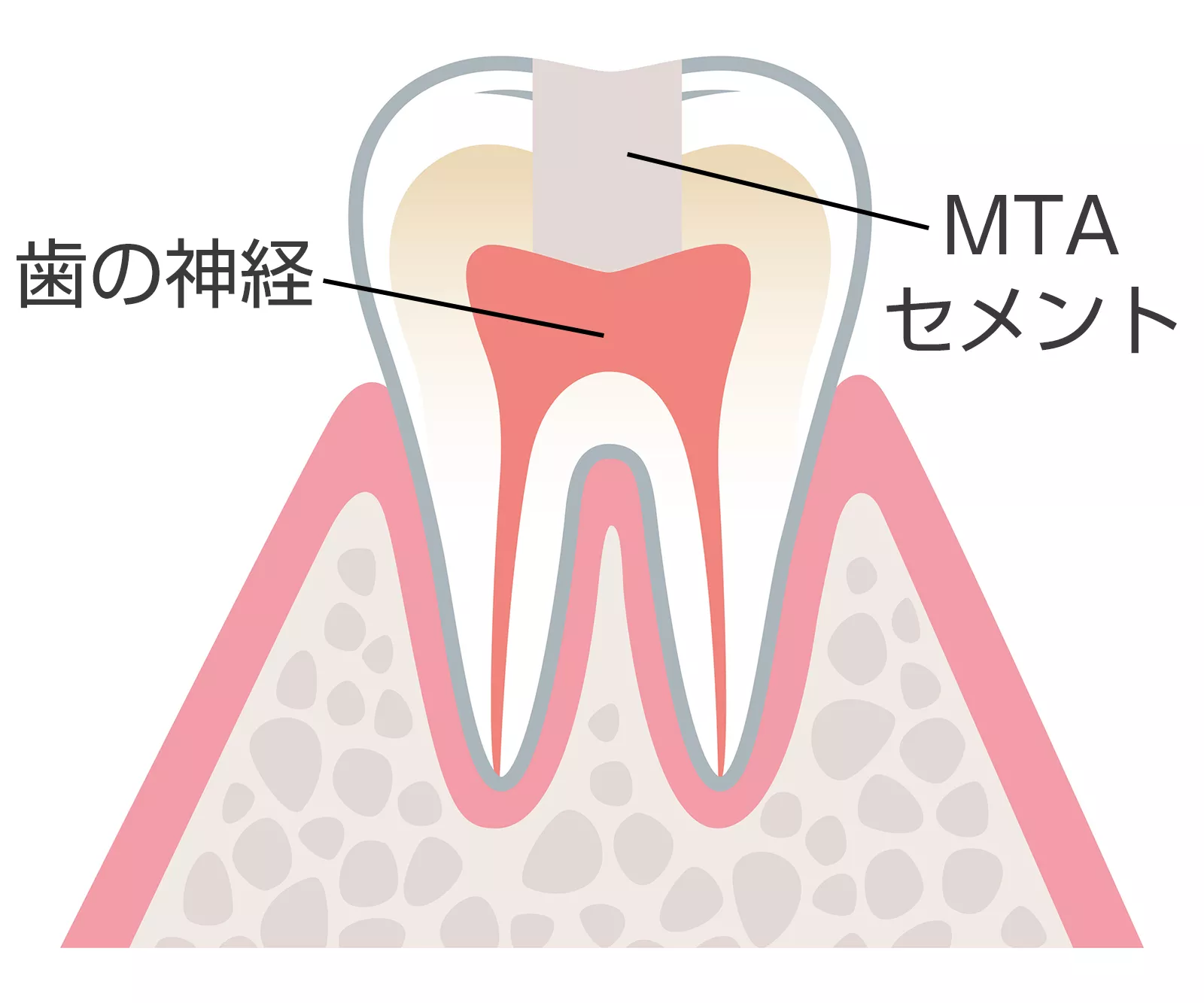 神経は露出していない状態のまま、削った部分にMTAセメントなどの薬剤を用いて処置を行います。 MTAセメントの